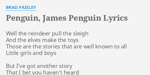 Brad paisley «penguin, james penguin» music video. Including all your holiday music favorites. Listen to penguin, james penguin from brad paisley's the collection for free, and see the artwork, lyrics and similar artists. The hottest music videos from today's biggest artists. He's penguin, james penguin that dapper little guy like a well dressed duck in a three piece tux he's santa's secret spy.