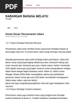 Artikel pencemaran udara meliputi pengertian, penyebab, dampak, jenis polutan dan cara menanggulanginya. Adanya pencemaran udara secara tidak langsung juga membuat lapisan atmosfer menjadi tercemar dan terancam berkat ulah kegiatan manusia sendiri. Pencemaran udara dan implikasinya pengenalan manusia adalah sebahagian daripada alam sekitar. Kesan utama pencemaran udara kepada manusia adalah sistem pernafasan. Pencemaran udara adalah antara faktor alam sekitar yang menyumbang kepada gangguan kesihatan menyerang pelbagai peringkat usia.