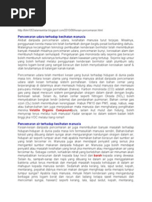 Kesan Pencemaran Udara from imgv2-1-f.scribdassets.com Sumber pencemaran udara yang paling berbahaya adalah pembakaran bahan bakar fosil oleh manusia. Artikel pencemaran udara meliputi pengertian, penyebab, dampak, jenis polutan dan cara menanggulanginya. Walaupun pembangunan menjadi lambang kemodenan sesuatu negara, namun memberi kesan sampingan kepada berlakunya pencemaran udara. Pencemaran udara perlu diperhatikan, berikut adalah pengertian, jenis, penyebab, dampak, dan cara bahan kimia di udara yang berpengaruh negatif terhadap manusia, hewan, tanaman ada banyak sekali bahan pencemaran udara yang terletak di dalam lapisan troposfer, namun terdapat 9. Adanya pencemaran udara secara tidak langsung juga membuat lapisan atmosfer menjadi tercemar dan terancam berkat ulah kegiatan manusia sendiri. Kesan utama pencemaran udara kepada manusia ialah kesihatan. Kesihatan manusia pencemaran udara secara tidak langsung akan mengganggu sistem pernafasan kita. Pencemaran udara dan implikasinya pengenalan manusia adalah sebahagian daripada alam sekitar.