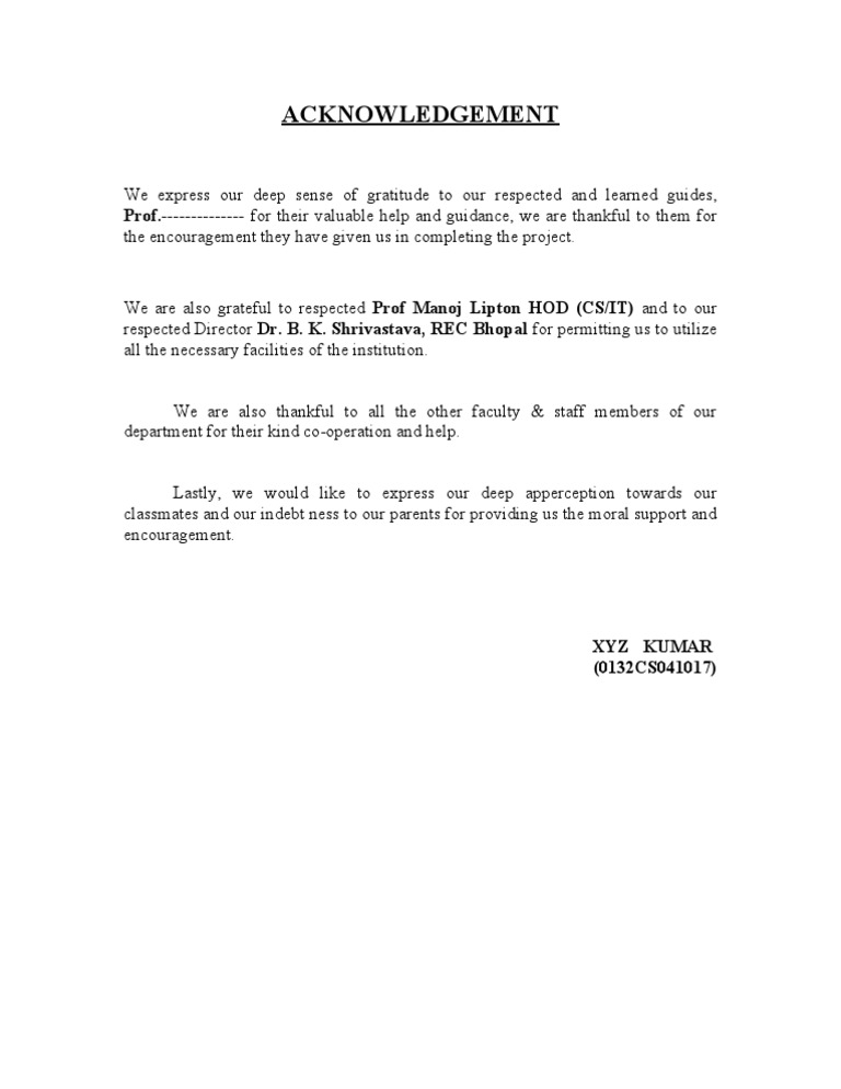 Doc Mba Project Reports Acknowledgement Sample 11 Jenny Cypres Academia Edu from 0.academia-photos.com A page of acknowledgements is usually included at the beginning of a final year project acknowledgements enable you to thank all those who have helped in carrying out the research. In this post, we will take a closer look at the mechanics of acknowledgements to help you answer the main question: So, here is a sample. Guide, letter example, grammar checker, 8000+ letter samples. This sample is about how someone says thank you for acknowledging other's favors in doing work, project, or research. I would like to express my deepest appreciation to all those who provided me the possibility to complete this report. Acknowledgement in project reports is used to thank all those people who have helped you directly or indirectly in preparing your project or thanking people for extending time, effort, money or trust. Here are some tips on how you.