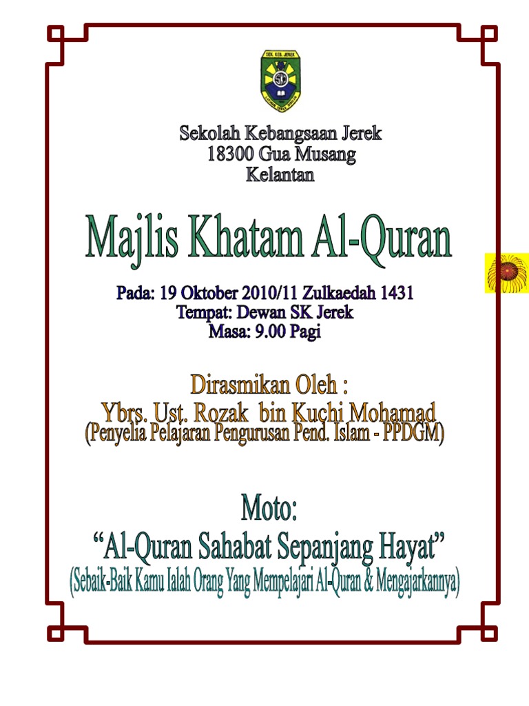 Mrdesign kad jemputan majlis khatam al quran akikah. Jemputan majlis tadarus dan khatam al quran perdana puspanita negeri selangor laman web puspanita negeri selangor. For more information and source, see on this link : Sekolah ugama beribi kad undangan majlis khatam al quran 2015. Thanks for sharing this information. You have described in a nice way. Majlis khatam quran dan berbuka puasa serta solat hajat pmr & spm. For more information and source, see on this link :. Sesuai untuk sebarang majlis keraian seperti majlis rumah terbuka, majlis perkahwinan, bertunang, berendoi, harijadidan, khatam al quran doa selamat. Ahli ahli majlis tertinggi parti pembangunan bangsa ndp kelmarin mengadakan majlis tahlil bagi al marhum sultan haji omar ali saifuddien sa adul khairi waddien dan bagi pejuang pejuang kemerdekaan yang telah pergi ke rahmatullah. Jemputan majlis tadarus dan khatam al quran perdana puspanita negeri selangor laman web puspanita negeri selangor. Khatam merupakan kata pinjaman daripada bahasa arab yang bermaksud tamat. Manakala untuk 100 unit rm1.80.