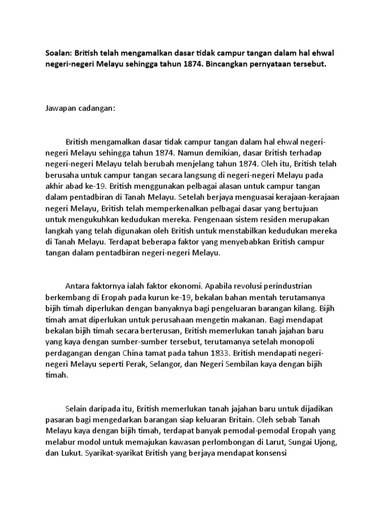 Campur Tangan British Di Negeri Selangor Adalah Disebabkan Oleh Perang Saudara Course Hero from www.coursehero.com Terdapat pelbagai faktor yang menyebabkan british campur tangan dalam sistem pentadbiran kesultanan di tanah melayu. Perkembangan semangat nasionalisme dan kebangsaan dalam penentangan penjajahan british, bangsa melayu lebih bersepadu tidak bergaduh atau berkonflik kerana hidup secara terasing dengan buruh. Sedangkan pesan adalah istilah menyampaikan permintaan, amanat, saran kritik, kepada sekolah. 2.0pentadbiran tradisional melayu dan kesan campurtangan british dalam pemerintahan di tanah melayu hal ini jelas menunjukkan pihak british telah campur tangan dalam bidang adat istiadat melayu. Konflik dalam kutipan buku tersebut adalah …. Disamping itu masalah kongsi gelap cina antara puak hai san dan ghee hin turut menyumbang ke arah perubahan dasar campur tangan. Campur tangan british di tanah melayu juga disebabkan oleh faktor politik. Tugasan berkumpulan mpu pengajian malaysia video dokumentasi oleh misha, anura dan ian.